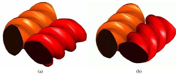 شکل 1 هندسه پیچهای در همرونده در اکسترودرهای دو پچیه (a) همسوگرد و (b) ناهمسوگرد.