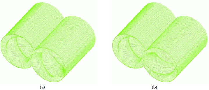 مشهای المان محدود[1] برای شبیهسازی جریان در اکسترودرهای دو پیچه همسوگرد و ناهمسوگرد به ترتیب در شکل 2a و 2b نشان داده شده است. مش اکسترودر همسوگرد دارای 313,830 المان (شکل 2a) و مش اکسترودر ناهمسوگرد دارای 303,334 المان (شکل 2b) بوده است. نرم افزار مورد استفاده از المانهای چهارضلعی خطی المان محدود، استفاده میکند این امر امکان درست کردن مش در چنین دومینهای پیچیدهای مانند دومین جریان در اکسترودرهای دو پیچه را ایجاد میکند.