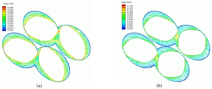 توزیع سرعت در سطح مقطع هر دو اکسترودر در شکل 3 نشان داده شده است. در شکل 5-3 سطح مقطع بالایی و پایینی به ترتیب در فاصله 10 و 40mm از ورودی قرار دارند، طول کلی اکسترودر برابر با 45 mm میباشد. فلشهای موجود در شکل 3 نشان دهنده اندازه سرعت میباشند. توزیع سرعت در اکسترودرهای همسوگرد (شکل 3a) و ناهمسوگرد (شکل 3b) دارای مشخصههای بسیار متفاوتی میباشد. در اکسترودر همسوگرد، بیشینه سرعت همواره دو نوک دو پیچ رخ میدهد.