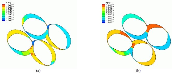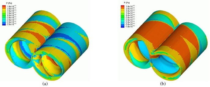 فشار پیشبینی شده در سطح سلیندر و پیچ در شکل 6 به نمایش درآمده است. از آنجایی که فشار در شکل 5 و 6 دامنه بسیار گستردهای دارد و مقادیر نهایی تنها در ناحیه کوچکی در نزدیکی لقی پیچ رخ میدهد، جهت نمایش دقیق فشار در نواحی دور از لقی پیچ از مقیاس لگاریتمی در شکل 5 و 6 استفاده شده است. باید به این نکته اشاره شود که در شکل 5 و 6 تغییرات فشار حائز اهمیت است و نه مقدار حقیقی فشار، چراکه مقدار حقیقی فشار با توجه به نوع دای مورد استفاده تغییر خواهد کرد. در شکل 5 و 6 در اکسترودر همسوگرد و نیز ناهمسوگرد افت فشار شدیدی در ناحیه لقی پیچ رخ میدهد، فشار در ناحیه لقی پیچ دچار افت میشود، فشار در مقابل لبه جلویی بسیار بالا و پشت لبه عقبی ناحیه لقی بسیار کم، میباشد. از آنجایی که پیچ در اکسترودر همسوگرد در جهت عقربههای ساعت چرخانده میشود، پیچ چپ، پلیمر را که توسط پیچ راست خارج شده بود، به بالای ناحیه در هم رفتگی هل میدهد.
